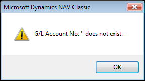 This error can occur in other places, and in plain English is basically telling you that you’ve missed some setup where a general ledger account must be defined. That nifty little double apostrophe means “blank” to NAV. I put “NAV G/L Account No. ” does not exist” into BING looking for someone who may have answered this question before, so if you’re looking for a solution for this error in other areas, try these links.