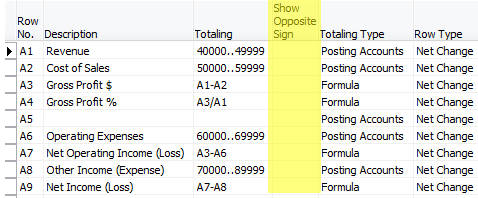 Use show opposite sign to reflect net income correctly on an income statement using NAV account schedules
