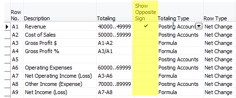 Use show opposite sign to reflect net income correctly on an income statement using NAV account schedules