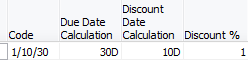 5.  Discounted terms follow a specific combination in the payment terms table. For discounted terms like 1/10 Net 30 (one percent discount if paid in ten days, otherwise due at thirty days), use this setup.
