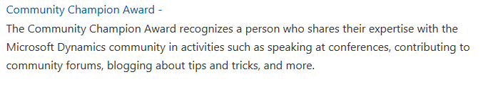 Posted: February 18, 2014 Filed under: Uncategorized 6 CommentsJust had to share with all of you who follow the blog that I’m joining the ranks of Microsoft Dynamics Convergence Customer Excellence award winners and am being recognized as a Community Champion in 2014! From the Convergence site, “The Community Champion Award recognizes a person who shares their expertise with the Microsoft Dynamics community in activities such as speaking at conferences, contributing to community forums, blogging about tips and tricks, and more.”