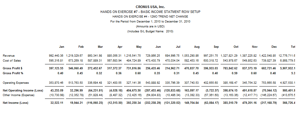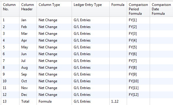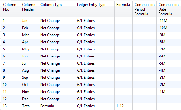 This is a classic example of an account schedule I see in use all the time by beginning account schedule users. Here is a 12 month net change column layout design using Comparison Date.