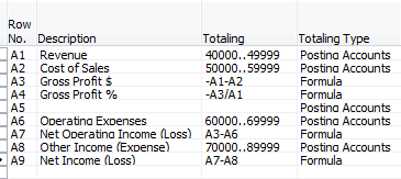 When getting started with a row setup, you need to choose either Posting Accounts or Formula in the Totaling Type column. These two options indicate whether you will be pulling numbers from general ledger accounts (posting accounts) or calculating against other rows (formula). There is another option Total Accounts that lets you pull numbers from total accounts from your chart of accounts instead if you are using total accounts instead of or in addition to posting accounts. Once you have defined your option in the Totaling Type column, then you need to populate the Totaling column with either general ledger accounts or formulas, depending on what you have chosen.