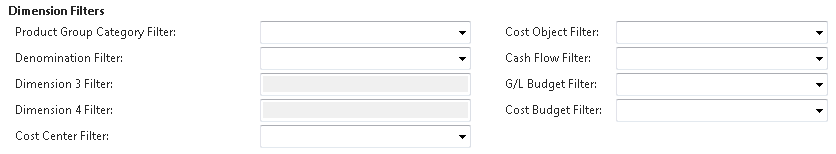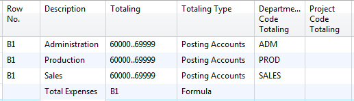 If you are a dimension user, you need to expand your selections to specific columns available in the row setup for dimensions. These are Dimension Totaling columns. The two global dimensions will always be available for use, but any other dimensions will appear with a label that is Dimension 3 Totaling or Dimension 4 Totaling (etc.) until you define which specific dimensions you want account schedules to use by defining them in analysis views. By filtering on dimensions in these columns, you can report at a deeper level and break down the segments of general ledger accounts to their dimension components in your financial reporting.