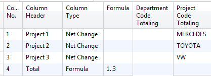 When getting started with a column layout, you need to choose either a definition of time like Net Change or Balance at Date or Formula in the Column Type column. These two options indicate whether you will be pulling numbers from general ledger accounts (posting accounts) or calculating against other columns (formula). If you have chosen Formula as your Column Type, you need to fill in the formula. The same options for Dimension Totaling are available here, just as they are for the row setup.