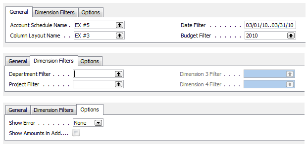 When filtering an account schedule in Role Tailored versions, you’ve suddenly got a whole new world of possibilities. 2009RTC makes things a little complicated, making us move through an additional screen on our way to the account schedule overview before we can apply additional filters once we get there. This has been my least favorite iteration of account schedules filtering because so many of the filters reset when you leave the screen, requiring you to continually redefine them when you come back or cheat the system by changing the work date in order to keep your sanity.