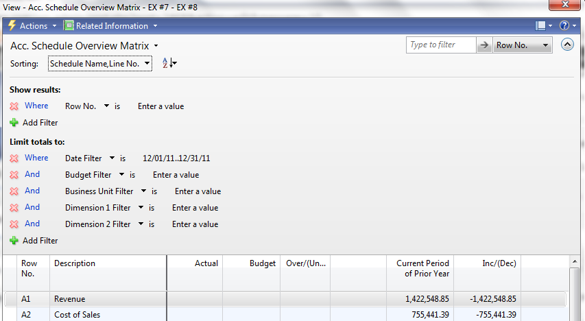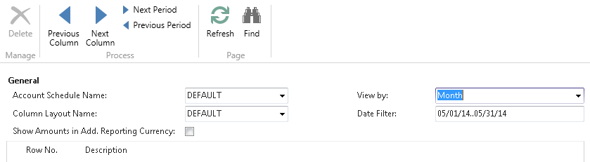 Posted: May 15, 2014 Filed under: Uncategorized Leave a commentThe primary difference between account schedules in Classic versions of NAV (NAV2009 and prior) and Role Tailored versions of NAV (NAV2009 and later) is mostly navigational. Most of the ways we construct row setups and column layouts have remained the same, but getting around the software is significantly different. Filtering is one of the areas where we see this the most.