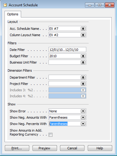 If you elect to print from the account schedules overview screen, choose the function button on the bottom right of the screen and choose Print. This brings up the following configuration screen where you can set a few parameters, and then choose Print.