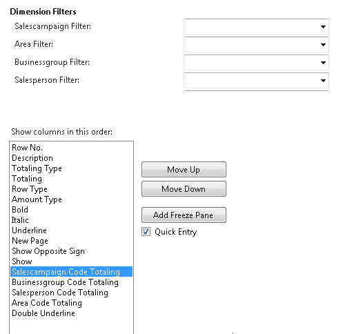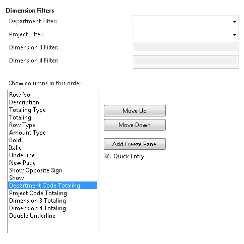 2. You can use dimensions in rows or in columns or in both rows and columns at the same time! Look in the screen shot above – you have the option of producing totaling by dimension for the same dimensions you have defined in your filters. Think of the possibilities: for this company you could simply see departments in all the rows and a cross section of projects in the columns, effectively giving you a one screen report of projects by department. The general ledger accounts are still there in the design of the rows, and the dates are still there in the filtering of the overall report, but you’ve got two more ways to expand your reporting. Now you’ve moved beyond financial reporting and expanded into reporting on operational areas.