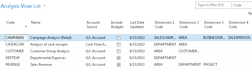 3. You can change the dimensions you report on with account schedules. You are not limited to just the global dimensions, you can actually report on four dimensions in any combination, effectively getting you access to any of the unlimited number of dimensions you can have. In order to do this, you need to define an analysis view, which we’ll go over in the next post, but for now, take a look at how that is different, both in the filtering as well as in the dimension totaling areas of account schedules. This example has an analysis view defined for four different dimensions, which would allow the company to look at entirely different things with their reports.