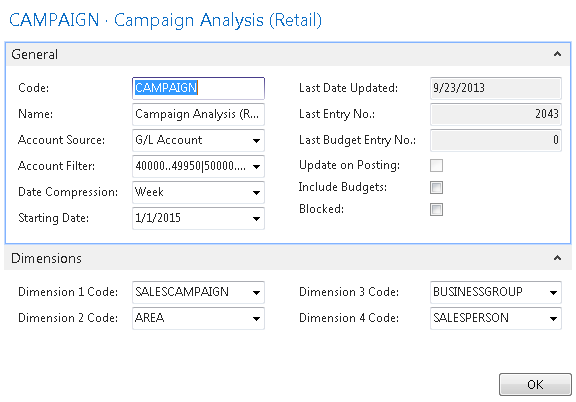 NAV budgets open up a few more possibilities for you where dimensions and account schedules are concerned. Take a look at this screen shot, using the classic client, that shows clearly what the available dimensions are in budgets.