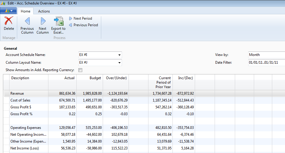 This end user view uses the column layout shown at the top of the page and the Basic Income Statement row setup.